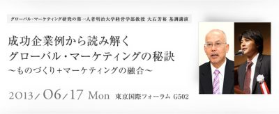 我々は「ものづくり」と「マーケティング」がアジア新興国での市場創造のために両輪になる事を目指し、そのためには「グローバル・マーケティング力」は不可欠だと考えます。今回はその「グローバル・マーケティング」研究の第一人者である大石教授が登壇される滅多にない貴重なセミナーになっております。